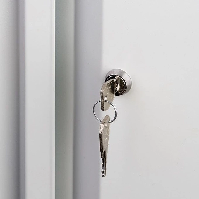 - На двери установлены ключевые замки Практик (2000 комбинаций) и магнитные защёлки, фиксирующие дверь в закрытом виде при незапертом замке.